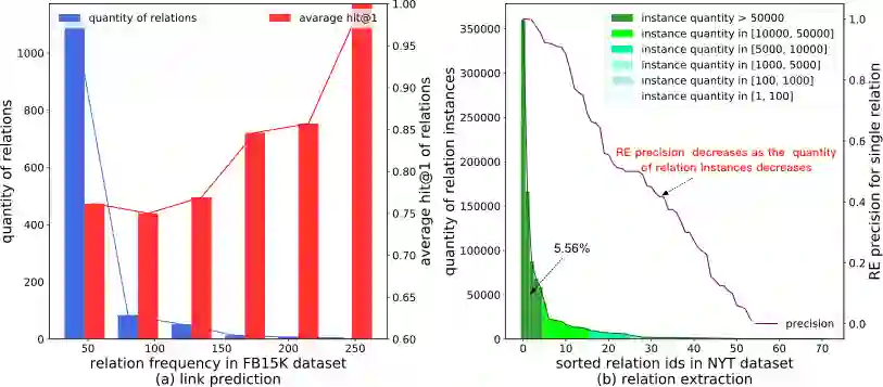 知识图谱补全(Knowledge Graph Completion,KGC),通过链接预测或关系抽取来补充知识图谱缺失的连接,主要困难之一是资源不足问题。KG中存在很多实例很少的关系,而且那些新添加的关系通常没有许多已知的训练样本。比如下图中展示的,KG大部分关系的样本都比较少,呈现出长尾分布,比起样本较多的关系,长尾关系的预测和抽取性能显著降低。(a)关系的链接预测结果与它们在KG中的频率高度相关,KG中频率较高的关系明显优于频率较低的关系;(b)关系抽取的效果,随着每个关系的样本数目减少而下降。本文的任务是在低资源条件下,预测KG中新的三元组,包括链接预测和关系抽取两个子任务。
