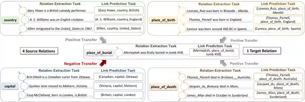 本文提出了一个加权关系对抗网络(Weighted Relation Adversarial Network,wRAN)的通用框架,该框架利用对抗过程,将从资源丰富的关系中学到的知识/特征,去适应不同但相关的低资源关系。wRAN框架综合考虑了三部分问题:对抗迁移学习(Adversarial Transfer Learning),核心思想是通过对抗性学习过程提取领域不变性特征,该过程能够减少源域和目标域之间的分布差异;关系对抗网络(Relation Adversarial Network),学习通用的关系不变性特征,以此弄清不同关系背后的语言变化因素,并缩小相关关系之间的语言差异;负迁移(Negative Transfer),区别于标准的domain adaption源域和目标域之间的标签空间完全相同且共享,wRAN考虑从多个源关系到一个或多个目标关系的适应,并且考虑了不同的关系可能对迁移产生不同的影响,离群的源关系在与目标关系做判别时可能导致负迁移。比如下图所示,wRAN可以从三个源关系(place_of_death,place_of_birth,country)中学习通用的位置信息,然后将隐含的知识应用于目标关系(place_of_burial)以提高其预测性能,而capital关系则会导致负迁移。