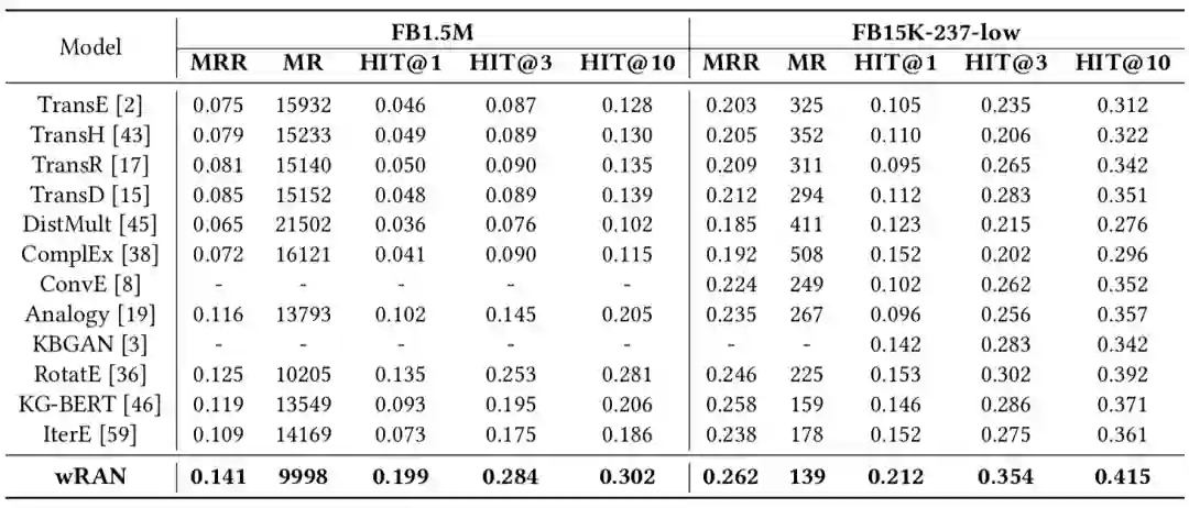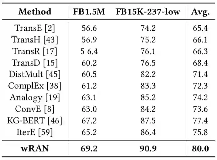 (4)实验表明,wRAN框架在低资源条件下的链接预测和关系抽取两个任务上均超过了目前最优模型的性能。