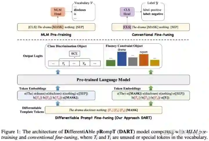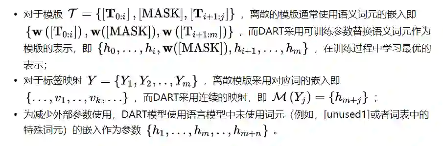 具体而言,本文提出的方法使用一类特殊的非语义词元作为模版和标签映射词,并在训练过程对这些词元的表示进行优化: