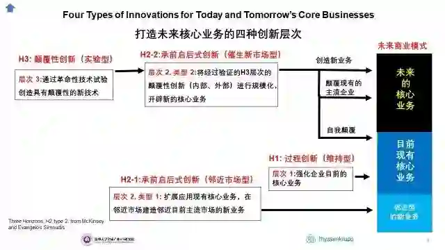 那么,如何才能找到可靠的依据,来帮助企业建立符合长远战略的创新组合,进而成功打造未来的核心业务呢?徐亚丁博士在分享中分别就颠覆性创新模式、精益创业理论、广角镜战略等理论和工具,在帮助大企业识别出未来核心业务的特征,以及预判企业的创新是否具有颠覆的可能等方面的作用,进行了详细地阐释。此外,他还以蒂森克虏伯为例,介绍了其未来战略中的商业构思及其创新的路径。