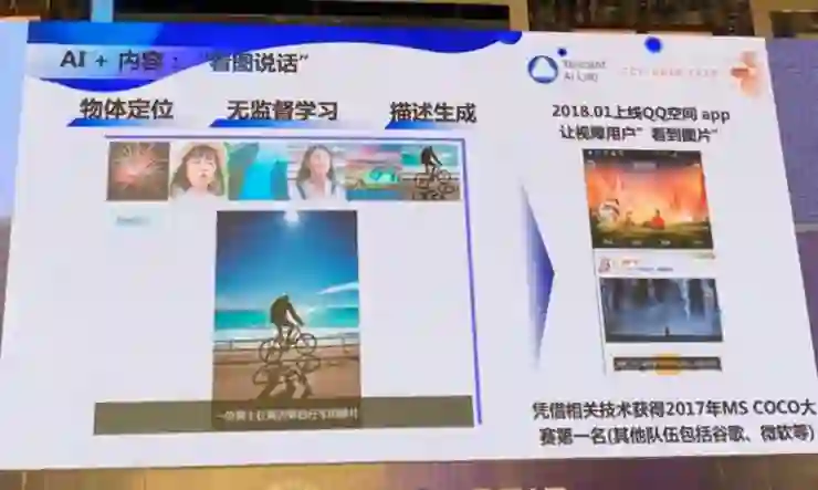 我们腾讯 AI Lab 在这方面也开始做了一点点工作。比如我们的看图说话项目能够用语言描述一张照片的内容,2018 年 1 月,我们上线 QQ 空间 app 让视障用户“看到”图片。