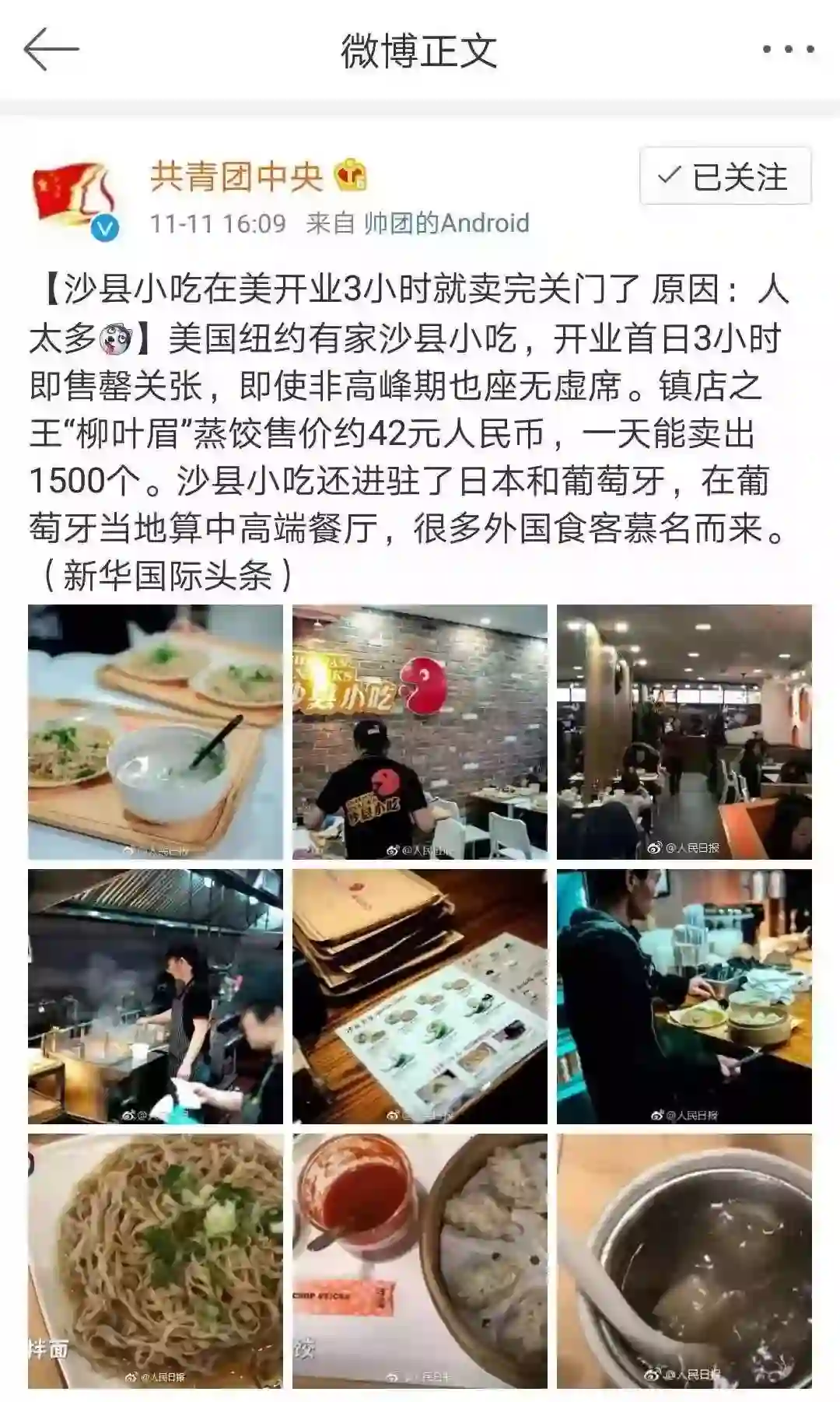 美国纽约有家沙县小吃,开业首日3小时即售罄关张,即使非高峰期也座无虚席。镇店之王“柳叶眉”蒸饺售价约42元人民币,一天能卖出1500个。沙县小吃还进驻了日本和葡萄牙,在葡萄牙当地算中高端餐厅,很多外国食客慕名而来。