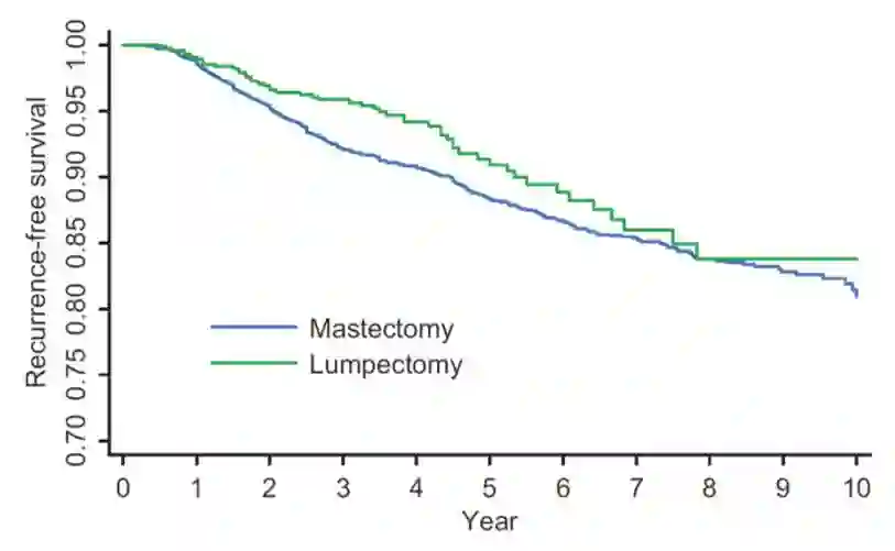 NSABP B-06入组了肿瘤小于4cm的I-II期乳腺癌,随机分成三组:单纯乳房切除术,保乳术,保乳+放疗。所有病人都行腋中下群淋巴结清扫。试验还规定:保乳后若同侧乳腺内肿瘤复发(IBTR),则不计入DFS事件。经过长期随访,保乳+放疗患者与全乳切除患者具有相似的DFS和OS。同时,放疗的加入,显著降低保乳术后肿瘤复发。B-06试验证实了保乳手术的可行性,也肯定了术后放疗的必要性;同期相似设计的Milan-I试验也重复了B-06的结果,两项研究于2002年在NEJM上发表20年随访结果,双星互耀,成为经典。以这些经验试验为基础,中国从90年代起开始尝试保乳治疗,目前上海肿瘤医院保乳率约30%,国内有些中心的数据还更高。经过术前严格评估和术中精确实施的保乳手术,安全性与全切相媲美。
