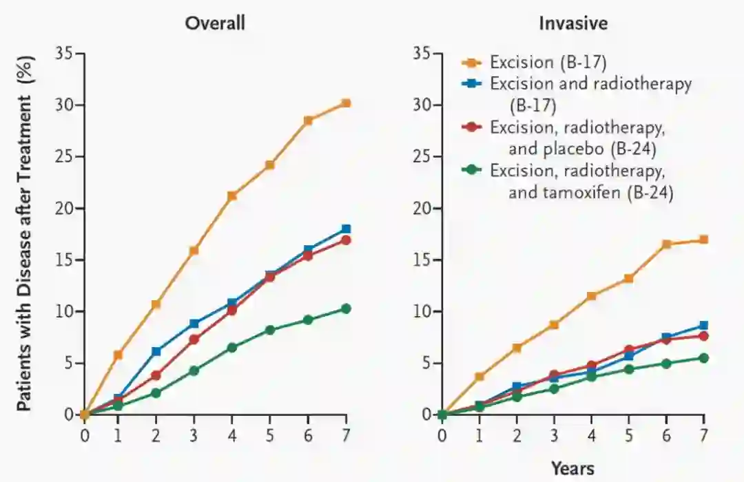 他莫昔芬是ER阳性浸润性乳腺癌降低局部复发和远处转移的重要方式,NSABP B-24证实了DCIS保乳术后辅助他莫昔芬治疗的价值。他莫昔芬比安慰剂降低了约30%浸润性乳腺癌和对侧乳腺癌发生率。B-17,B-24,以及UK/ANZ DCIS等研究共同确立了对ER阳性DCIS保乳患者,术后放疗与内分泌治疗都是重要的降低局部复发的措施。