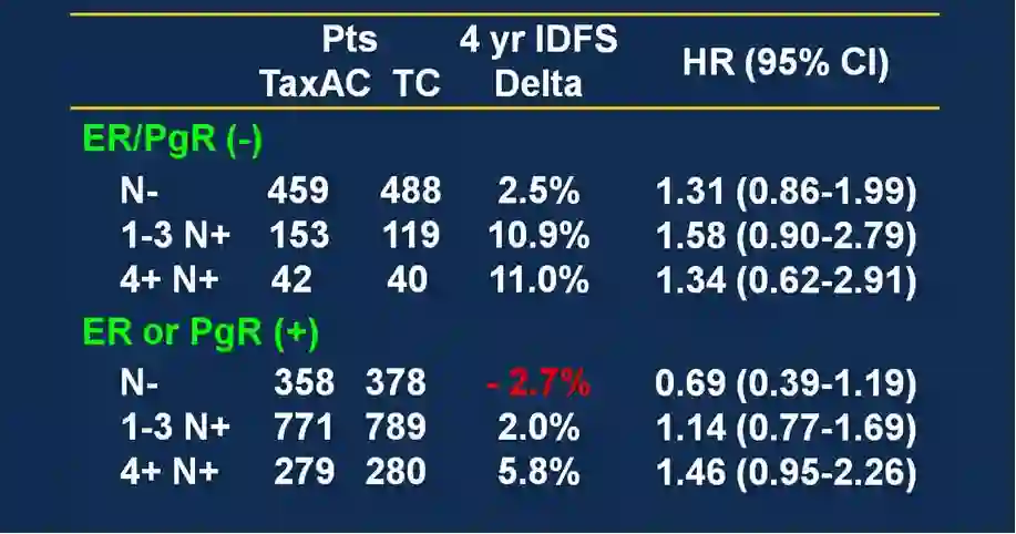 图5:ABC联合分析:按照ER/PR状态和淋巴结转移数目进行分层。TaxAC代表蒽环紫杉联合方案;TC代表去蒽环的紫杉+环磷酰胺方案。