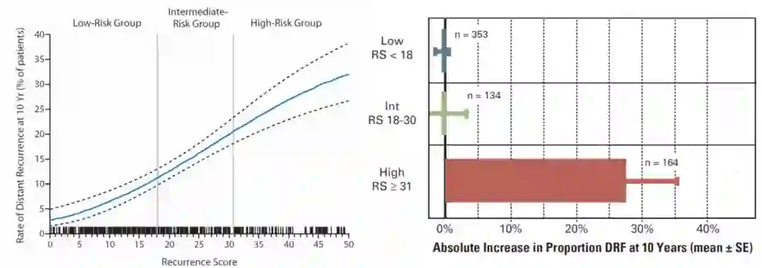 图7:21基因(Oncotype DX)的开发验证基于NSABP B-14与20,左图通过B-14数据确立18与31分作为低危、中危、高危的分界;右图通过B-20数据确立对高危患者化疗获益显著,对中危患者化疗获益不明确。