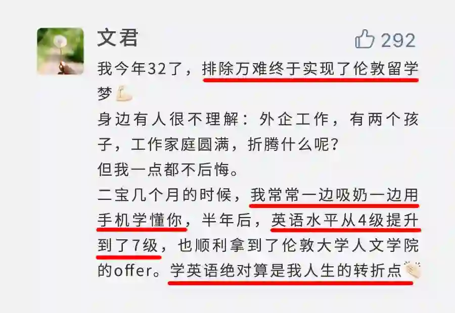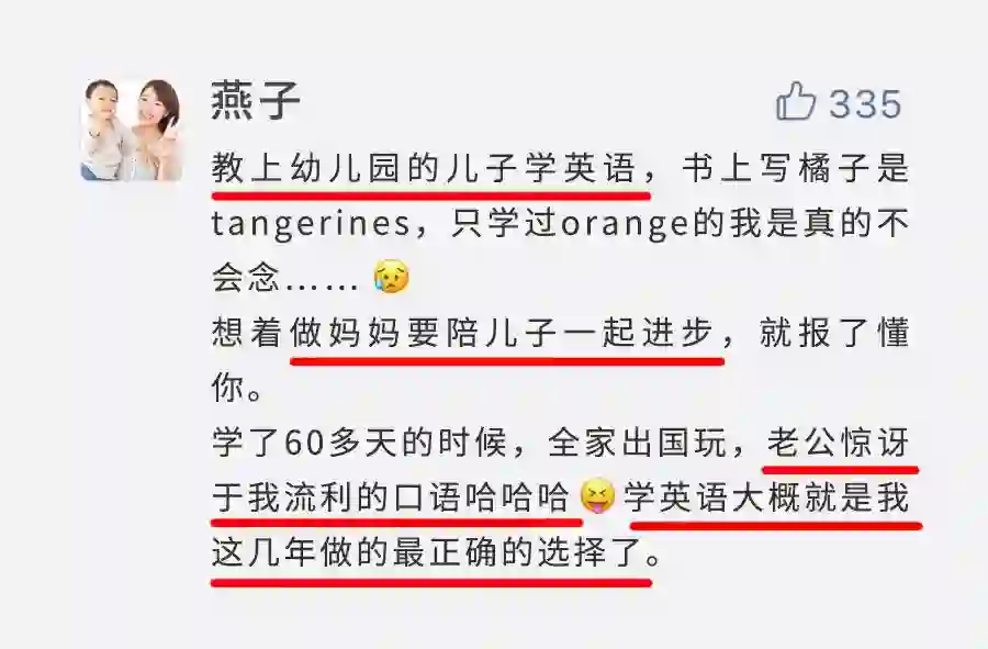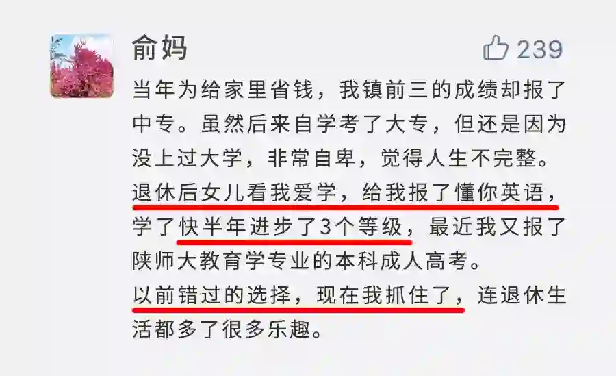 而学英语,就是这样一件看似“不起眼”的疯狂小事,带给她们的,不仅是英语这项技能,能用来解决很多现实问题;同时她们也收获了勇气和自信,把自己从自卑情绪中拯救出来,活得轻松坦然自在。