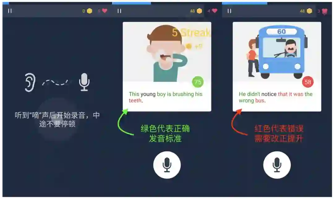 有美国新闻播音员原声导读、打分纠音分色标注等功能,课后还有错误难点回顾注释,学习情况可实时查看,你一定学得会;