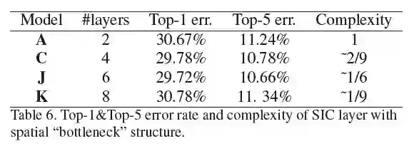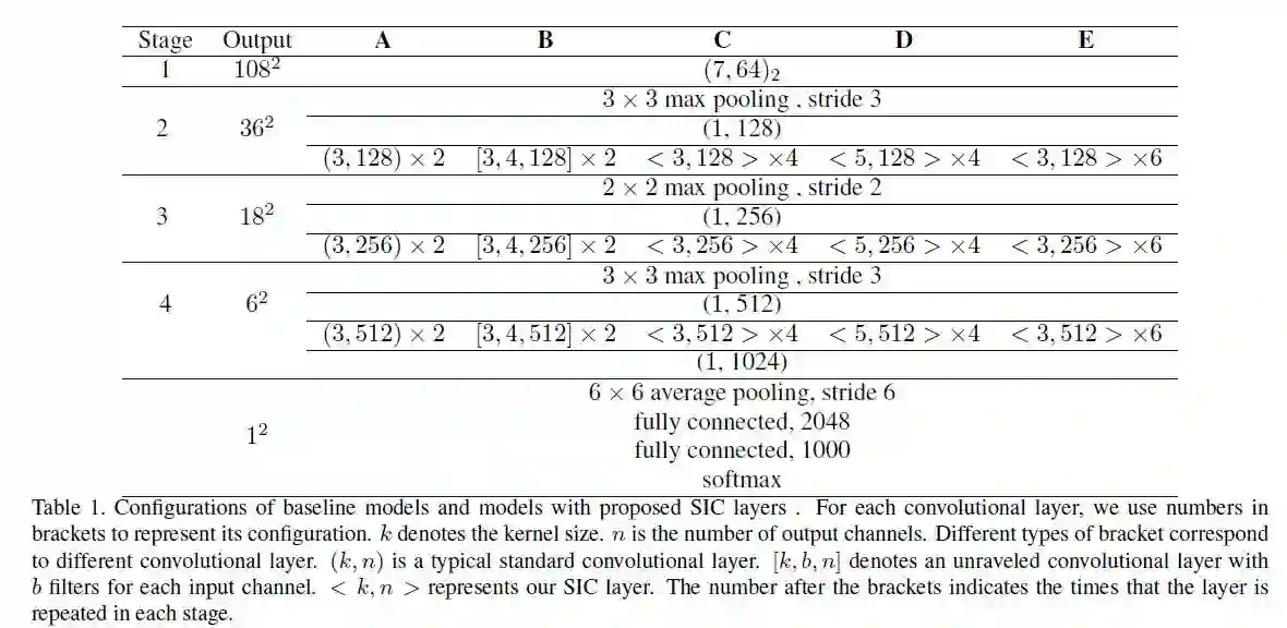算法2是本文提出的标准SIC,具体方法已经写得很清楚了。该算法利用了残差思想,将一个标准的卷积操作分解为顺序操作的b次通道内卷积,最后通过线性映射P组合起来。在这样操作下,计算量是原来的b/k^2。当设置b<k^2时,就能起到降低复杂度的目的。