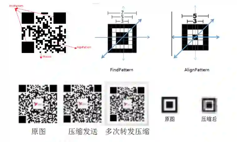 · 压缩失真:我们会经常遇到一种情况,图片在发送者的微信里能识别(原图),但是在接收者的手机里却不能识别(压缩图)。这里简单科普一下,二维码在识别的时候,对“定位点”的清晰度要求比较高,因为是根据扫描像素行/列匹配对应比例来寻找定位点。而在图片的压缩后,图片的定位点已经完全“糊”了。