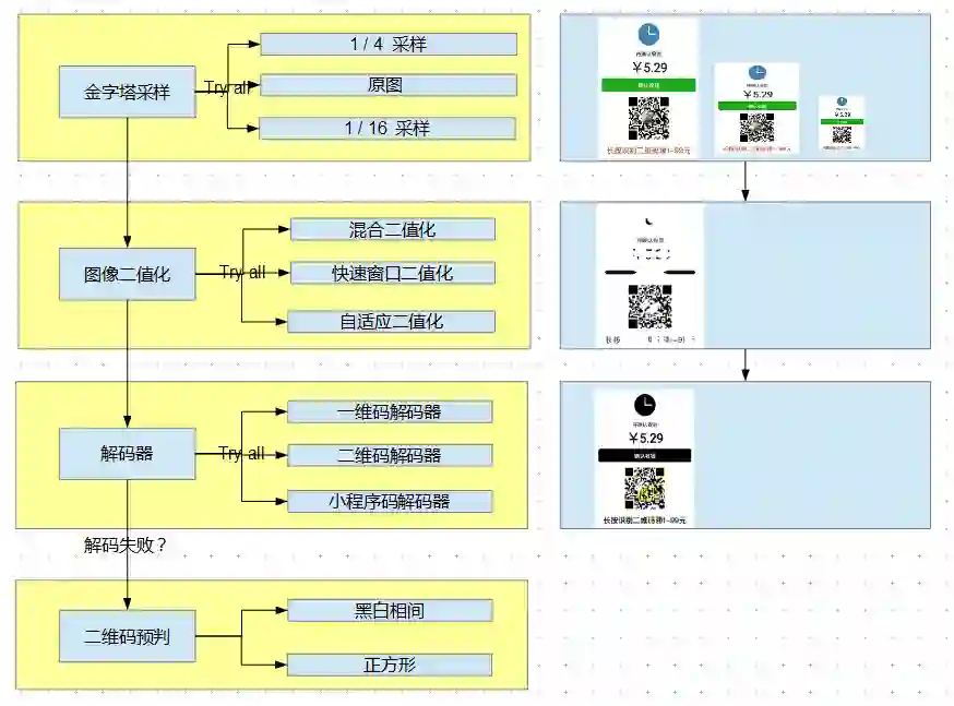 想要解决上面的问题,这里需要简单讲一下目前QBar识别引擎的工作流程,主要流程为:金字塔采样 ->二值化 -> 解码器 ->二维码预判。金字塔采样主要作用为缩小图片以降低后序的运算复杂度;二值化目的是为了让整个解码过程变得简单,毕竟码的信息与复杂的颜色无关,只关注“黑”与“白”;解码器为每种码制的信息提取模块,解码时我们会按顺序遍历每个解码器来尝试解码;二维码预判为我们自研的小码检测算法,主要用于小码自动放大场景。