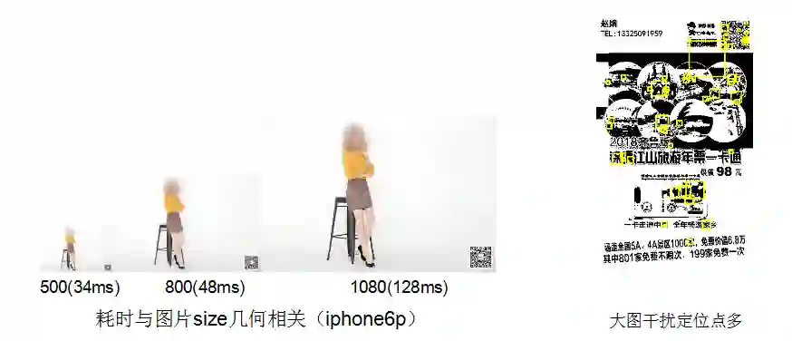 · 大图小码:在长按场景中,设计师们为了让图片“美观”,将二维码打得尽量小。QBar用传统方案来解码,图片越大,越容易找到疑似“二维码”的区域,因此消耗的时间是几何倍数的增长。大图解码慢在长按识别场景尤其明显,在部分低端机型有些case可能识别时间超过1s。
