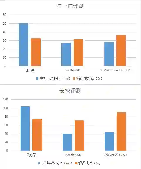 此外,为了提高在长按场景中大图小码的检测召回率,我们在实际应用上使用了多分辨率进行检测,对于精度高,耗时长的长按场景,我们使用了400x400的输入,而在扫一扫场景内,我们则使用了300x300的小分辨率。