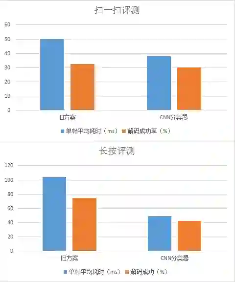 最终,我们使用了DenseNet作用网络原型,在保证识别率的前提下不断精简网络,模型大小只有13K,单帧耗时6ms(100x100)。可以看到,长按场景在加入了超分技术后,解码成功率有了质的飞越,由旧版本的74.57%上升到89.24%;而在扫一扫场景下,由于对实时性要求较高,我们则使用了“双线插值法”放大小码,解码成功率由32.19%上升到36.23%。