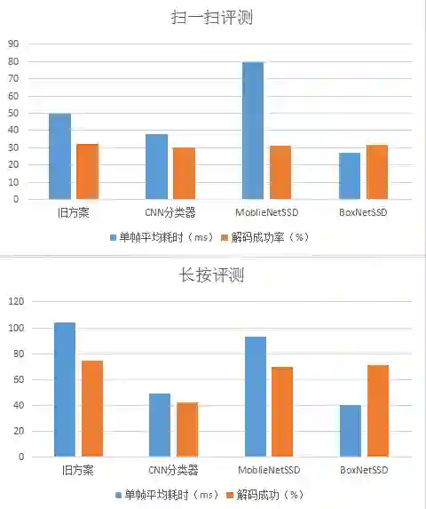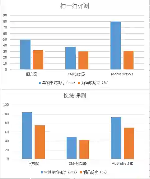 可以看到,在接入了分类器后,QBar的单帧耗时明显下降,可是,识别率同时也下降了,长按场景尤为明显。这里不仅是因为模型准确率没有达到100%,更重要的是,这个方案不能解决一图多码与大图小码的问题。