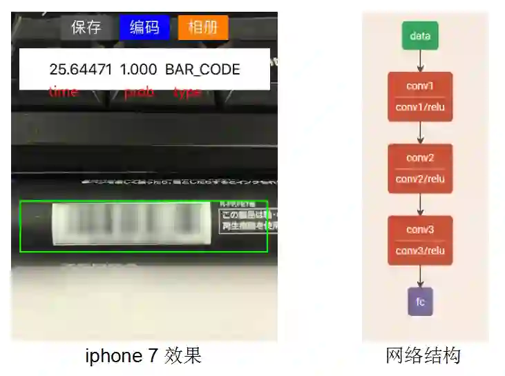这是我们在深度学习上做的第一个实验,CNN分类器,网络模型非常简单,输入图像resize到300x300后就是3层卷积,分类精度在扫码测试集上可以达到98%,单帧运算耗时只需25ms(由于该模型比较简单,只有卷积和全连接层,因此运行框架完全为我们自己简单实现的)。实际对比旧方案性能如下: