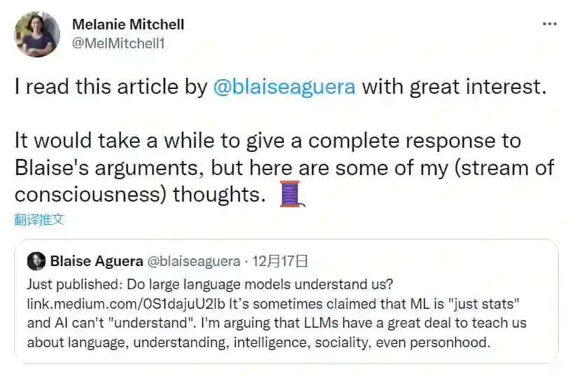 圣达菲研究所教授梅兰妮·米切尔 (Melanie Mitchell) 就在 Twitter 上发帖,对Aguera y Arcas 的观点进行了很有意思的反驳。