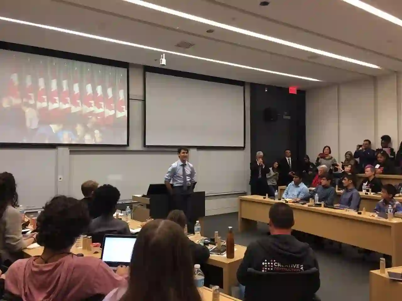 总理特鲁多随后在多伦多大学向学生推销人工智能技术的重要性(机器之心前排拍摄)