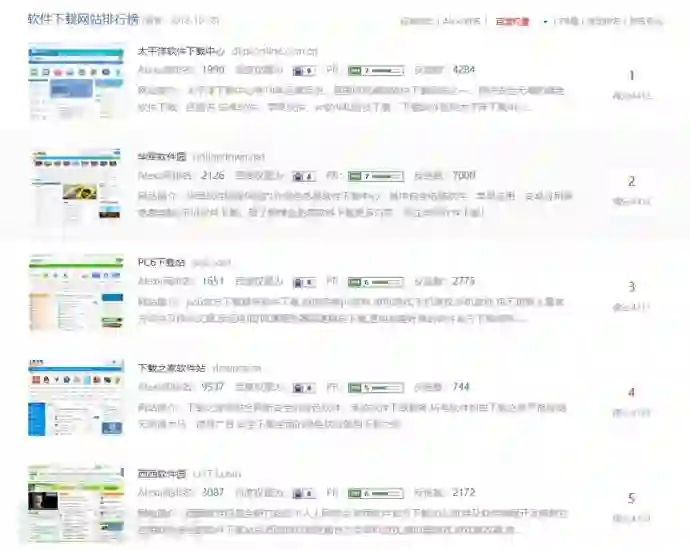 PC端一直是重灾区,而且存在时间也比较久。根据站长工具统计的百度权重数据来看(虽然不是百度官方数据,但也具有比较可靠的参考价值),传统PC端下载站中排名前5的分别如下图:
