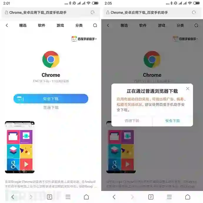继续点击普通下载,页面则会继续弹窗提醒“通过普通下载,应用又被劫持的风险”,需要再次进行二次选择,而如果通过安全下载,则百分之百需要多安装一个百度手机助手,你会怎么选?