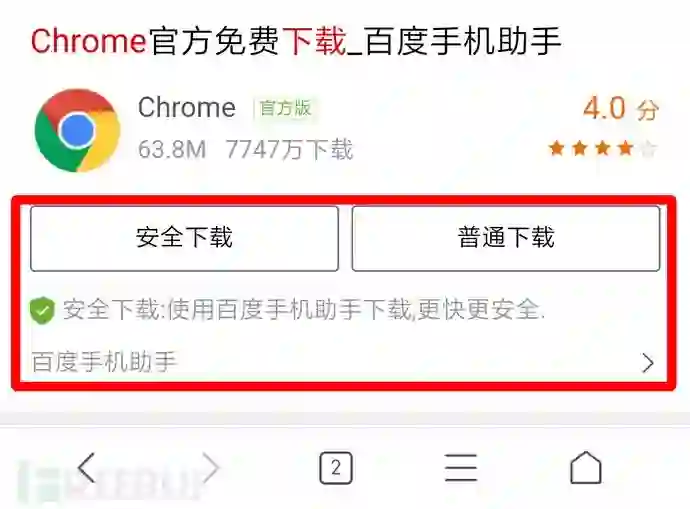 在搜索结果页上可以直接点击下载按钮“安全下载”和“普通下载”,而且已注明需“使用百度手机助手下载”,这里没问题。