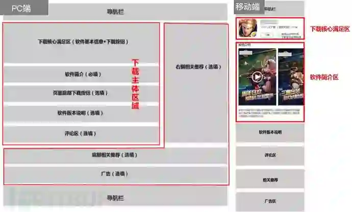 另外,该《规范》还给出了PC端和移动端下载站界面设计最优的选择方案。其中笔者注意到两点对于页面下载区的要求: