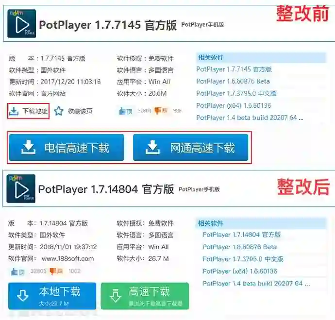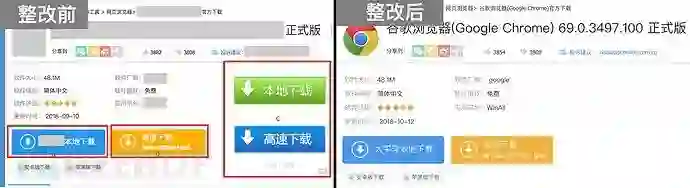 你会发现整改之后的下载区去掉了“高速下载”的广告位,这部分本身就存在诱导下载行为,用户点击之后并不会下载自己想要的软件。