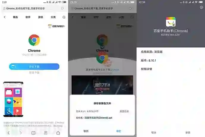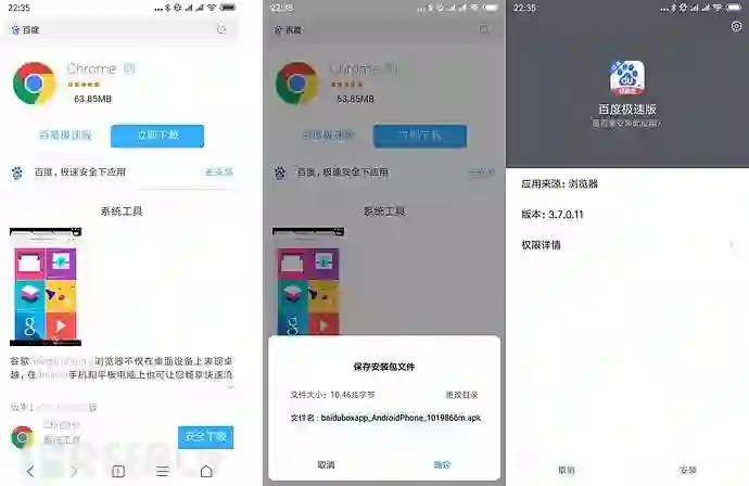 而进入下载页之后,蓝色“安全下载”更加显眼,而普通下载的按钮被弱化。点击安全下载,会下载一个名为“百度手机助手(XXX).akp”的软件,类似一个下载器安装完成之后才会继续下载“XXX”目标软件安装。