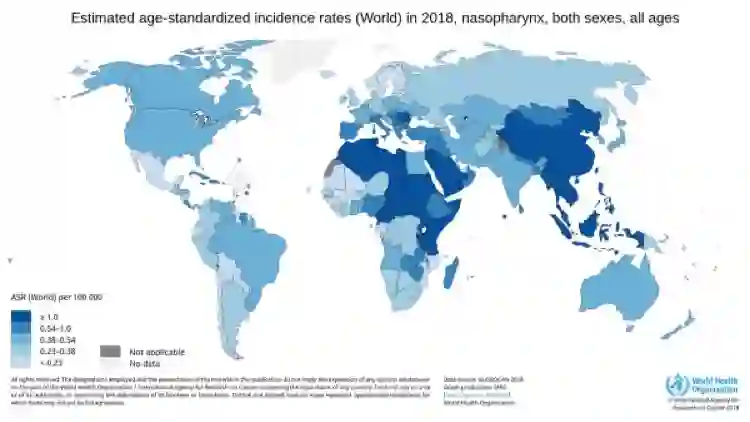 根据世界卫生组织GLOBOCAN 2018年数据, 我国鼻咽癌年新增例数、死亡例数分别占全球的46.9%与43.0%。