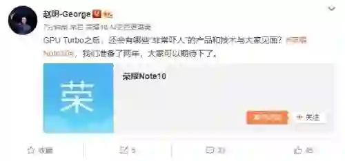 7月4日上午,荣耀总裁赵明在微博上宣布,荣耀Note 10即将推出,该机除了搭载GPU Turbo,还会有其他的“吓人”技术。