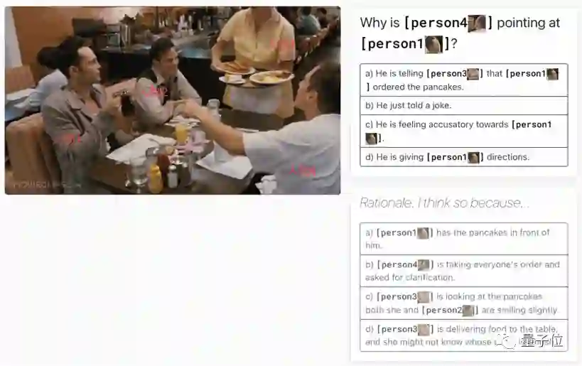 而VCR的目标是将识别提升到认知(cognition),例如「为什么人物4指向人物1?」,更进一步,计算机在第一步做出答案选择之后,还要在第二步解释选择这个答案的理由(rationale)。如下图分别展示了这两步的问题和答案选项。
