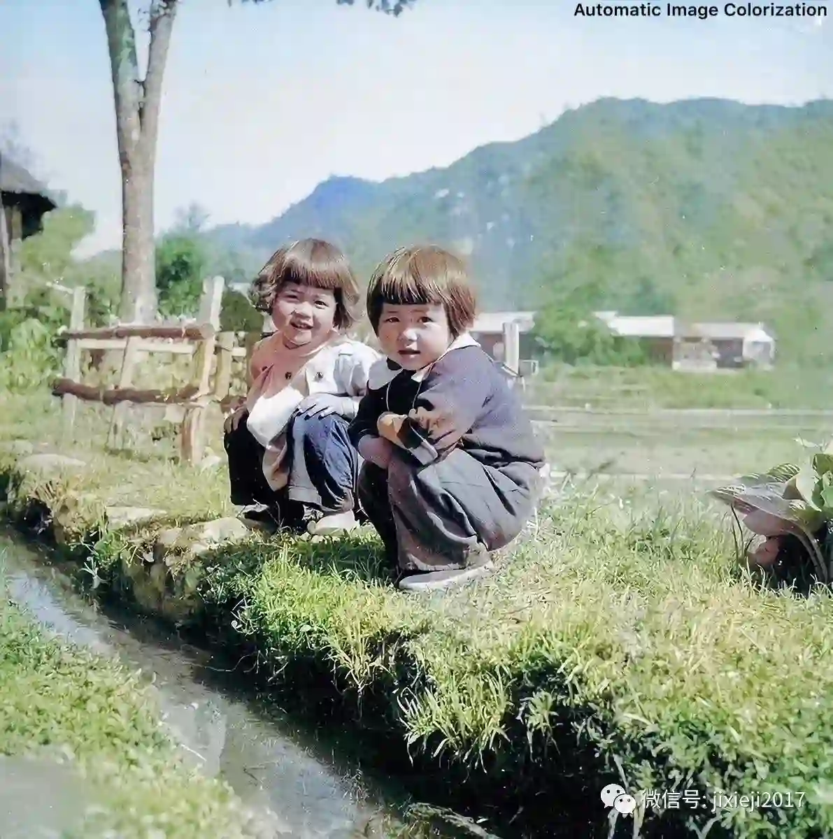 在战后的日本,两个孩子在河边(大约在1950年左右,摄影师未知)