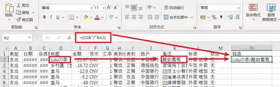 统一消费商户和备注:Bluecoins 的每一笔消费都可以分别设置标题(在哪儿买)和备注(买的啥),这两项数据反映在 .csv 文件中是两栏数据;而钱迹仅提供备注信息,所以需要将 Bluecoins 这两栏数据合并,这里用到的是 Excel 的内容合并函数,比如 A1 栏中是标题「少数派」,B1 栏中是备注「钱迹会员」,那 C1 栏中可以用 =(A1&"/"&B1)将二者合一,变成「少数派/钱迹会员」这样的形式导入到钱迹中。