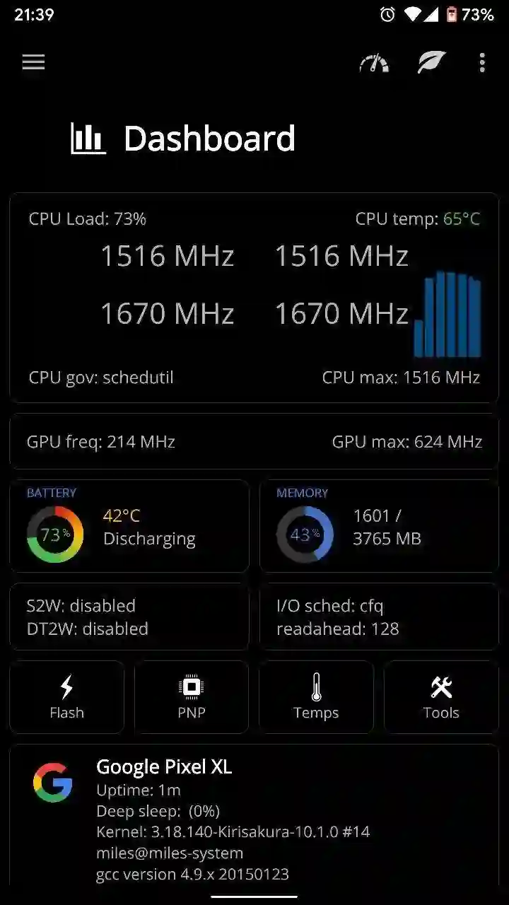 刚解锁当然立刻就刷上第三方内核玩玩看,一瞬间都感觉前几年折腾 Android 的青春又回来了 🌚。初代 Pixel 所移植的 EAS 所用的调度是 sched,也有名为 Kirisakura 的第三方内核移植了成为后续 EAS 主流调度的 schedutil,但这个内核破坏了手机的通话功能,让我漏接了好几个电话(也怪我没有仔细看后续的帖子)。