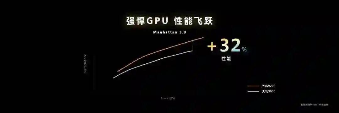 GPU 性能是重头戏。天玑 9200 搭载了升级的 Immortalis-G715 GPU,GFXBench 曼哈顿 3.0 跑分提升多达 32%,相对的功耗降低 41%,能效比出色。
