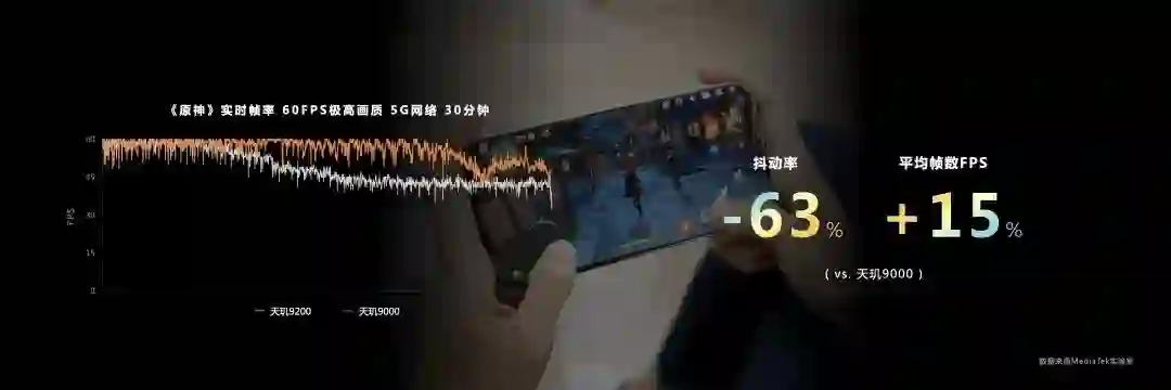 拿跑分游戏《原神》来说,天玑 9200 的帧数可以提升 15%,抖动率减少 63%,无限接近稳 60 帧。而诸如《王者荣耀》这样的国民手游,天玑 9200 已经能完美驾驭,可在极致画质、120fps 模式下满帧运行 1 小时。
