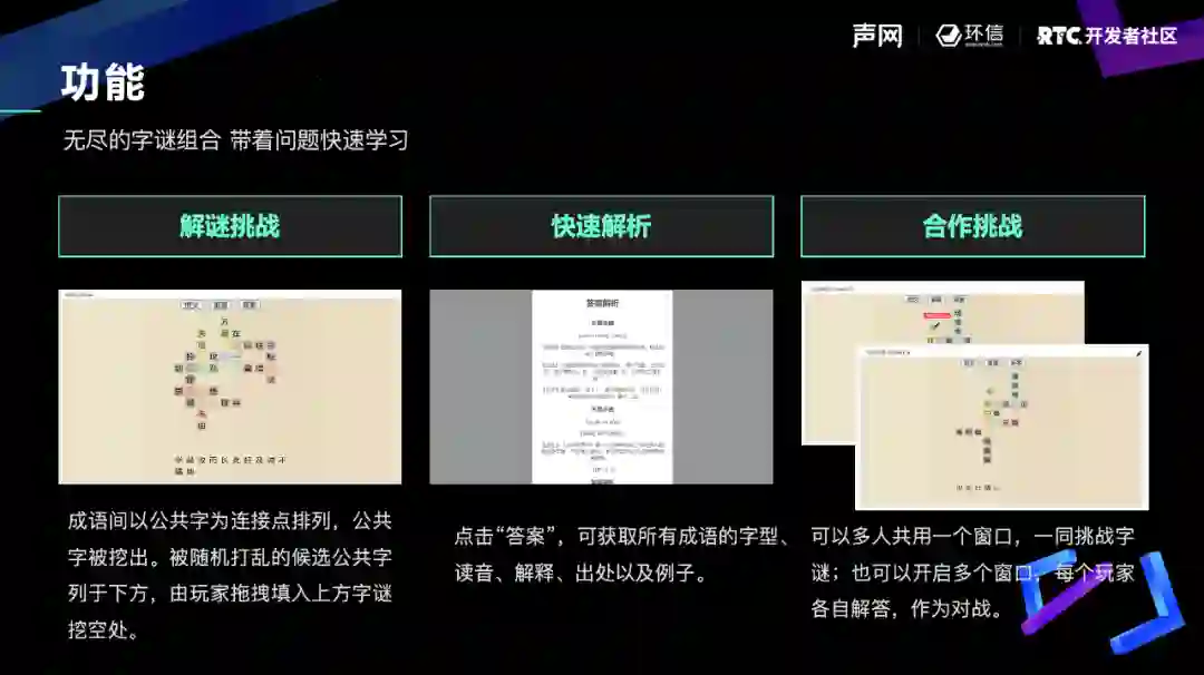 在紧张刺激的比赛过后,最终展现的作品也不负众望,他们以互动白板为载体,收录了近 3 万个成语的读音、解释、出处及用例;提供了合作与 PK 两种模式,操作上易于上手,在休闲之余,也具有一定的教育意义。