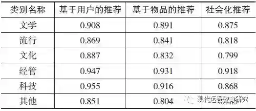 从上面两张表中我们可以清楚地看到,在图书推荐中,研究所提出的社会化推荐方法推荐准确率平均误差(MAE)小于基于用户的推荐方法和基于物品的推荐方法,显示出较好的推荐效果。
