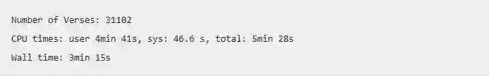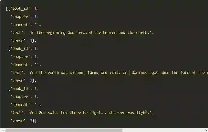 我们将文本从 json 格式中解析出来,并存入verse_docs这个变量里,耗时大约三分多钟,平均一秒钟处理 160 段经文。作为参考,我们可以看一下bible_json的前三行。
