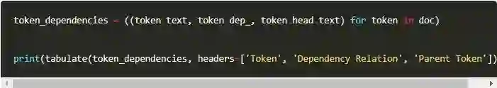 依存关系也是词条属性的一种。spaCy提供了一系列API,可以帮助我们得到词条的各种属性。下面我们将打印出各个词条的文本,词条间的依存关系及其父词条(头词条)的文本。