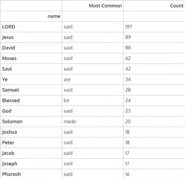 我们结合使用了这三种工具,挖掘出圣经中的主要角色以及他们的行为。我们将这些角色和行为可视化,从而了解到每个角色的主要行为在何处发生。