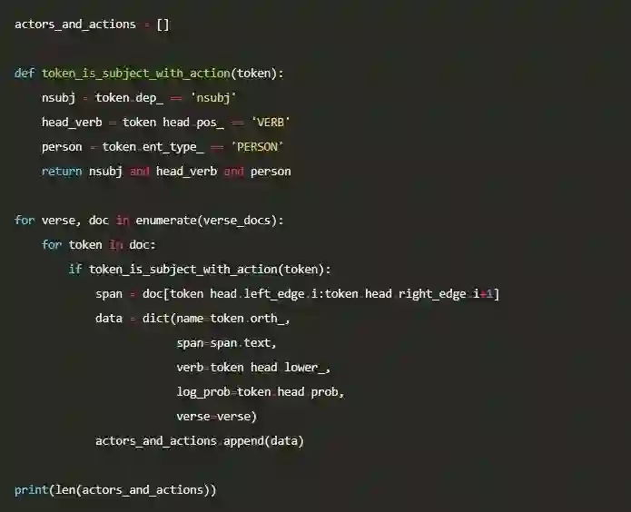 分别使用上述提到的方法,效果都挺不错。然而,自然语言处理的真正威力在于我们可以将这些方法结合起来,从而提取出符合语言模式的信息。我们可以使用词性标注,依存分析和命名实体识别去理清大量文本中出现的所有角色及其行为。考虑到圣经的长度及其提到的大量角色,它正是一个应用这些方法的好例子。