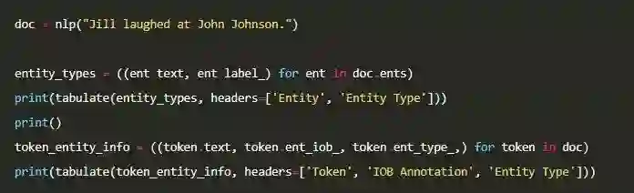 在下面的代码中,我们使用docs.ents函数打印出所有文档级的命名实体。接着,我们打印出每一个词条,它的 IOB 标注及所属的实体类型(如果该词条是某个实体一部分的话)。