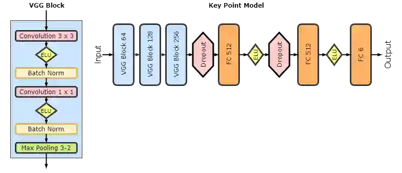 再说一次,特征点模型是受一系列 VGG 族模型启发、通过深度卷积神经网络实现的回归模型。VGG 模块由两个带有指数线性单元激活、批归一化和最大池化的卷积层组成。下图是其架构: