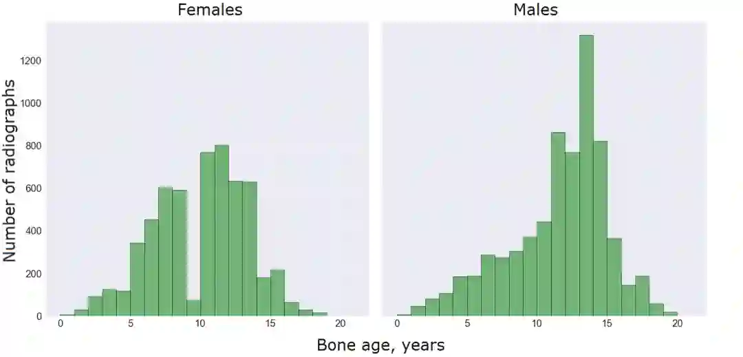 数据集来自于举办了儿科骨龄挑战赛 2017 的 RSNA。他们从斯坦福儿童医院和科罗拉多儿童医院获取了放射图像,这些图像是在不同时间不同条件下用不同设备拍出来的。专业的儿科放射医师对这些图像进行注释,他们将这些图像与 Greulich 和 Pyle 所著《手部骨骼发育放射图解》进行比较,并在报告中记录骨龄。大赛组委会从这些报告中提取了骨龄信息,并将其作为模型训练的真值。