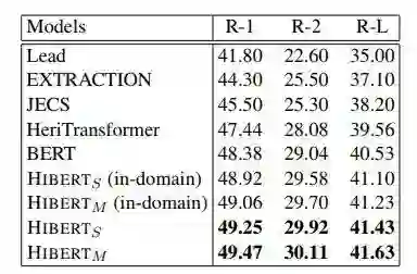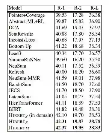 HIBERT在两个著名的摘要数据集CNN/DailyMail和New York Times上结果都表现很好,超越了BERT及其它在2018年和2019年初提出的所有摘要模型。