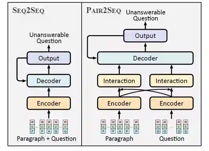 该论文提出根据可答问题、原文和答案来自动生成相关的不可答问题,进而作为一种数据增强的方法来提升阅读理解系统的表现。我们利用现有阅读理解数据集SQuAD 2.0来构造不可答问题生成模型的训练数据,引入Pair2Seq作为问题生成模型来更好地利用输入的可答问题和原文。