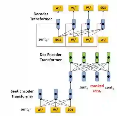 与BERT类似,HIBERT需要先进行无监督的预训练(pre-training),然后在下游任务上进行有监督的微调(finetuning)。HIBERT预训练的任务是掩盖(MASK)文章中的几句话,然后再预测这几句话。如图1所示,文章的第三句话被MASK掉了,我们用一个Decoder Transformer去预测这句话。