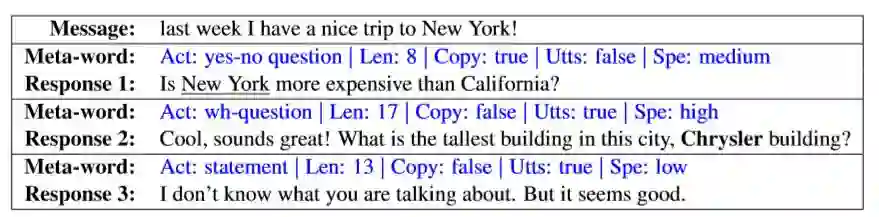 在这篇论文中,我们提出用meta-word来表示输入和回复间的关系。Meta-word代表了一组回复属性(如图14中的回复意图(Act),回复长度(Len)等)。利用meta-word进行对话生成的好处包括:(1)模型具有很好的可解释性;(2)通过订制meta-word,开发者可以控制回复生成;(3)情感,话题,人格等都可以定义为meta-word中的一个属性,因此诸如情感对话生成,个性化对话生成等热点问题都可通过该论文提出的框架解决;(4)工程师们可以通过增加或调整meta-word不断提升生成模型的性能。